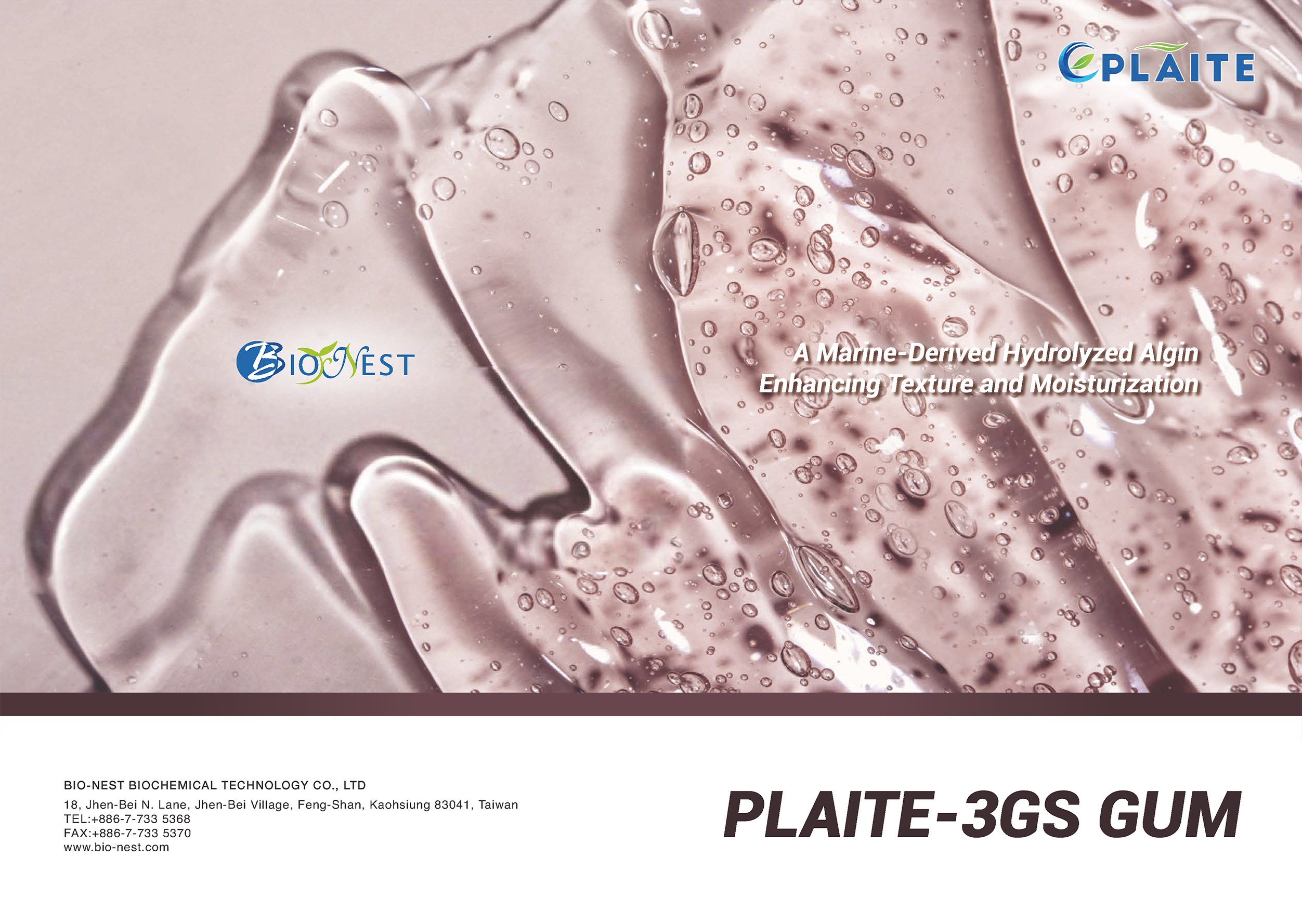 - PLAITE-3GS GUM 是一種以海洋來源的水解藻膠(Hydrolyzed Algin)為基礎的化妝品原料,旨在提供卓越的保濕、補水及肌膚柔滑效果。其獨特的分子結構可增強鎖水能力,形成輕盈且具延展性的薄膜,改善肌膚觸感,同時維持長效保濕。
